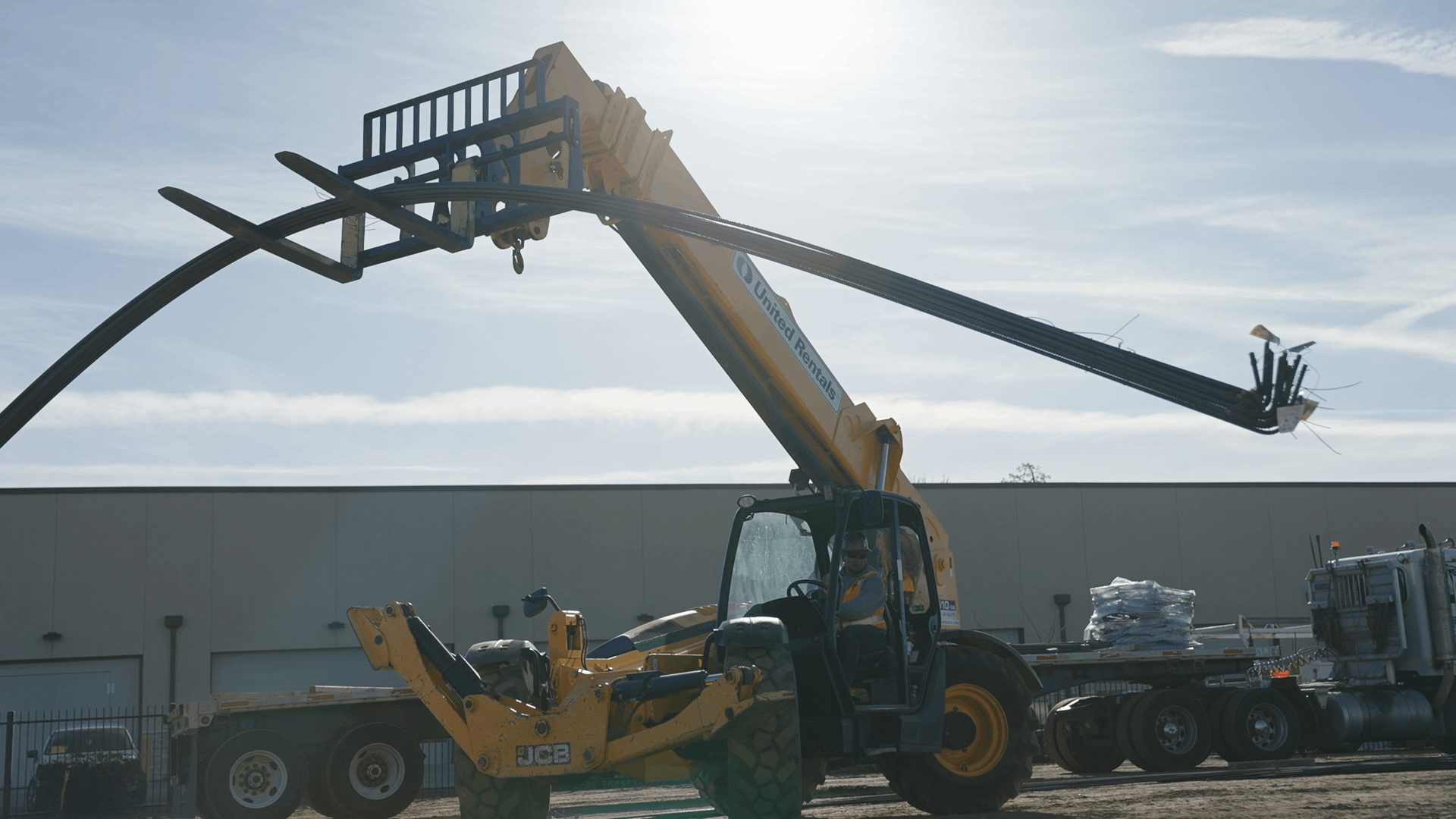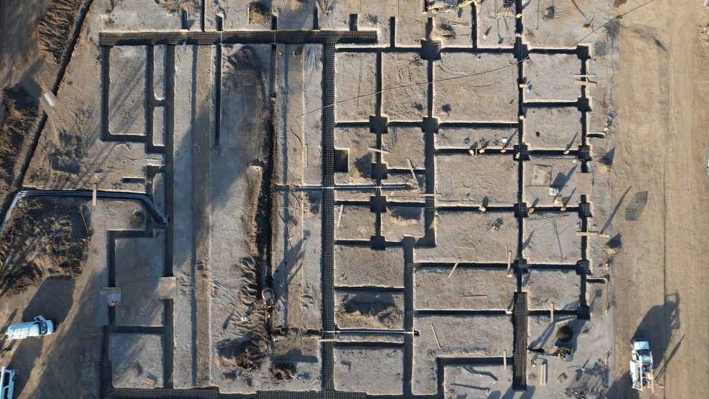 We first had to create trenches for isolated footings, continuous footings, and grade beams. The team hauled away the excavation spoils after the trenching was completed. For the footings, we had to form and set reinforced steel, then pour and finish each concrete footing as detailed on plans. We had to sub rebar for CMU in footings for 36″ for CMU to tie to.