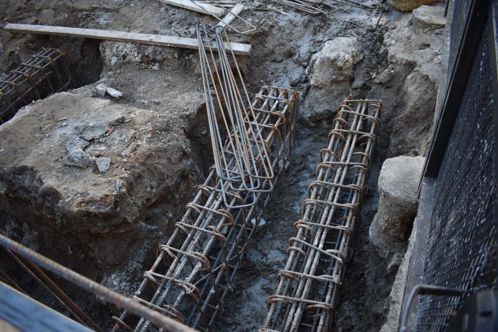 - Construct grade beam footings, retaining wall (6.5′ total height), and 14 pilasters