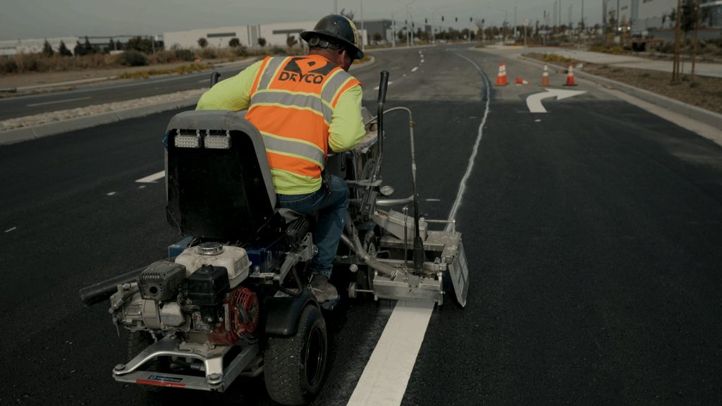 DRYCO’s striping team first had to grind and remove the existing striping in the parking lot. Then, the team completed striping for the Tracy Logistics Center in several different ways: